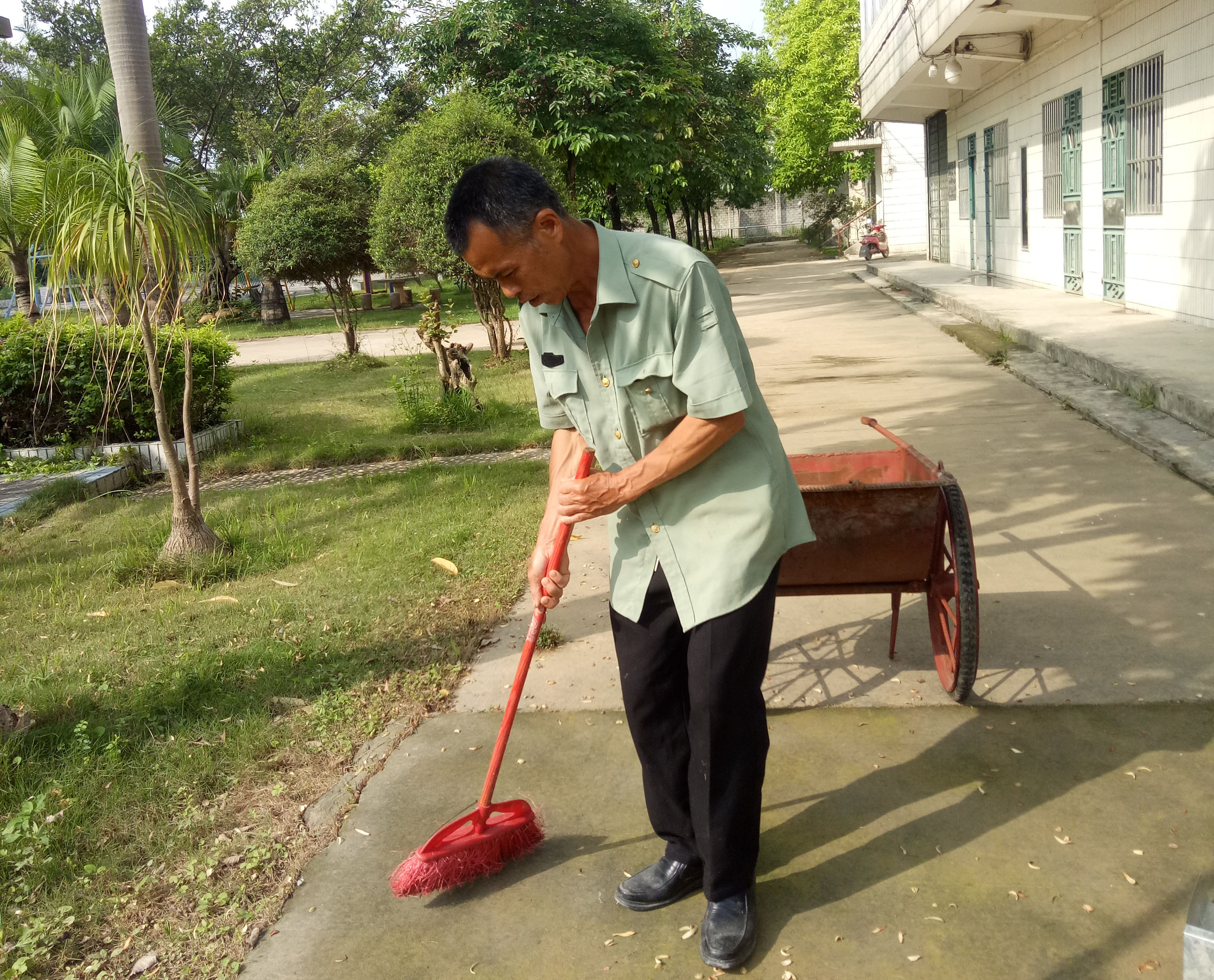 54歲的莫金刀是第一次外出務工,之前他在家務農,兼職做村里的保潔,微薄的收入根本承擔不起兩個女兒上大學的費用,但又沒有技能和途徑找得到其他工作。翔路公司安排莫金刀負責建設辦的保安兼保潔工作,讓他有了一份穩(wěn)定的收入,能夠支撐起整個家庭。